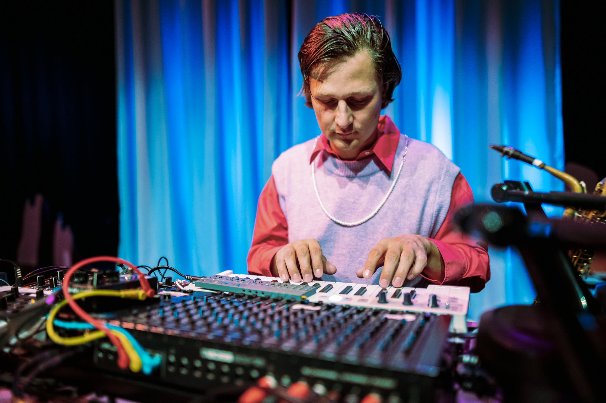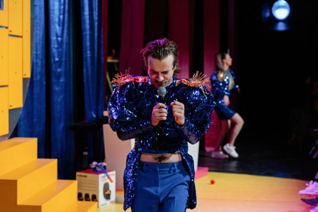 “De speelse atmosfeer is grotendeels te danken aan de enscenering in de jaren negentig-Memphisstijl. Jonge vormgevers Sjaan Hofstede en Pleun Verhees vulden de ruimte met tafels bekleed in pastelkleurig bont en een dambordvloer.”